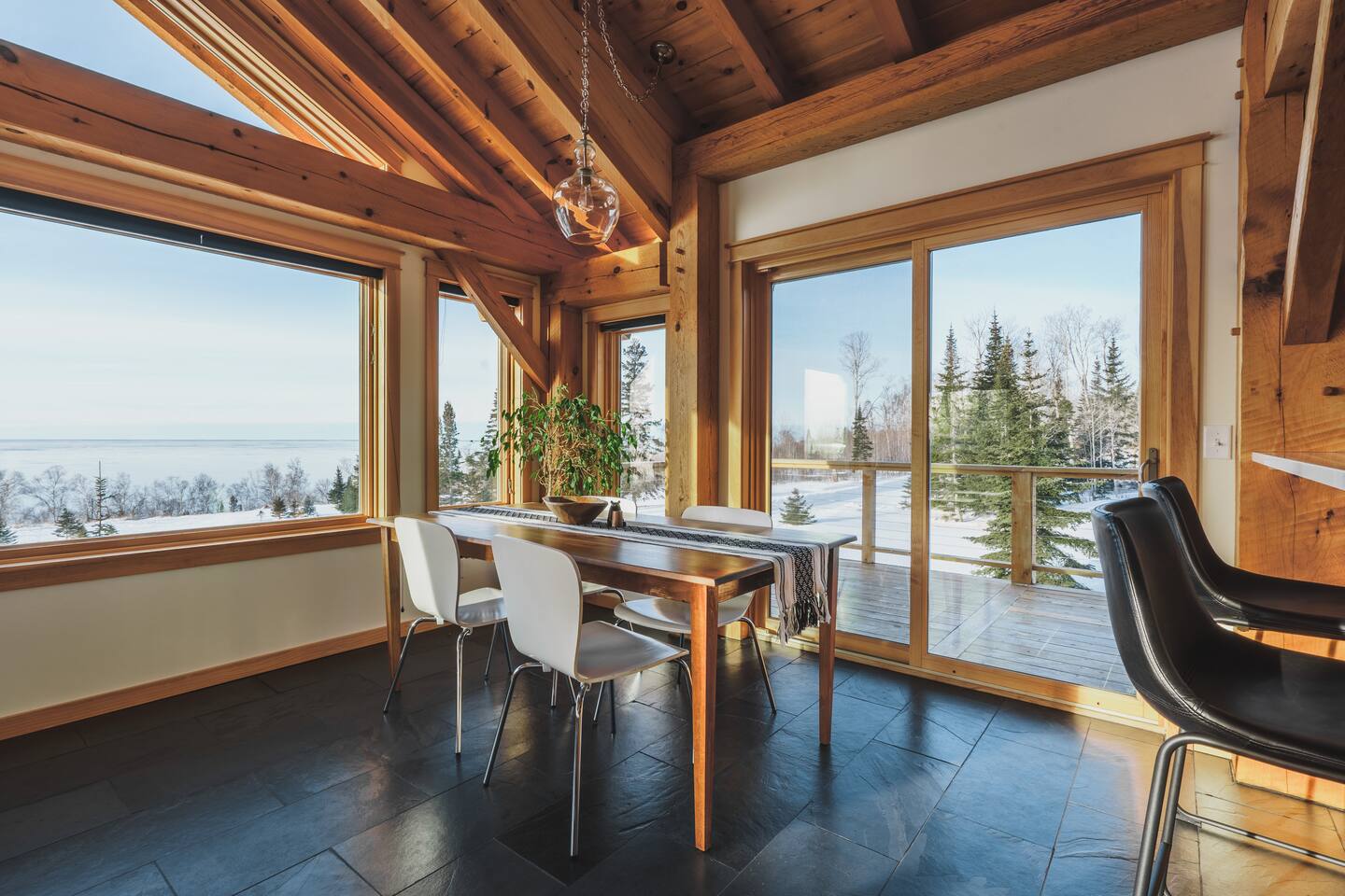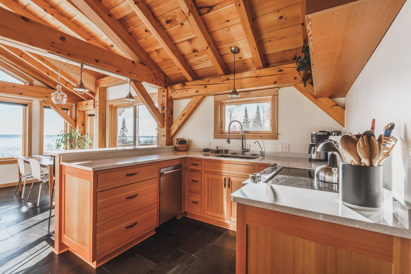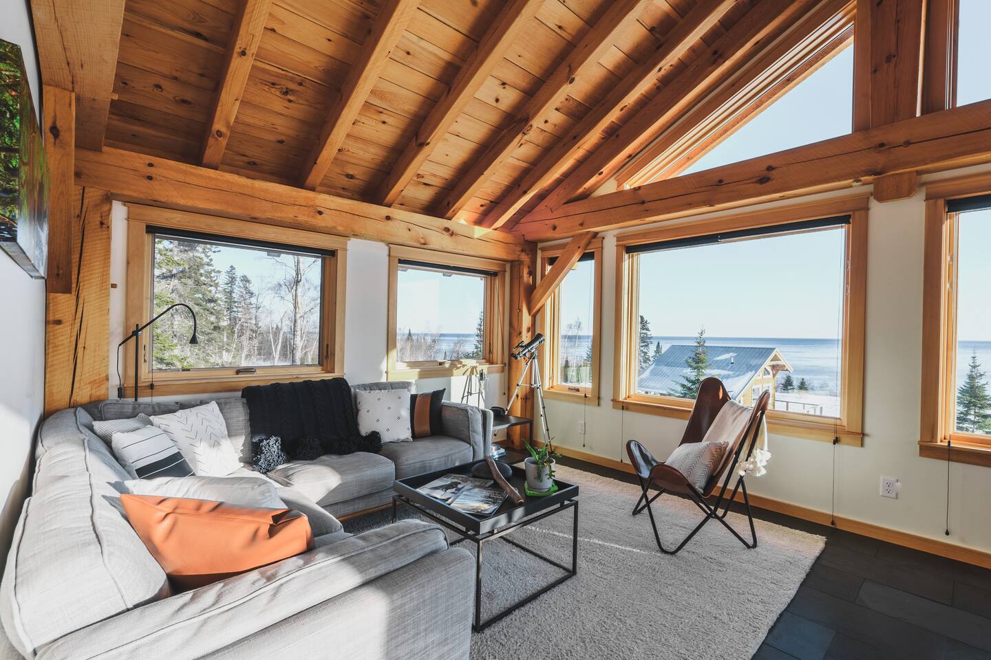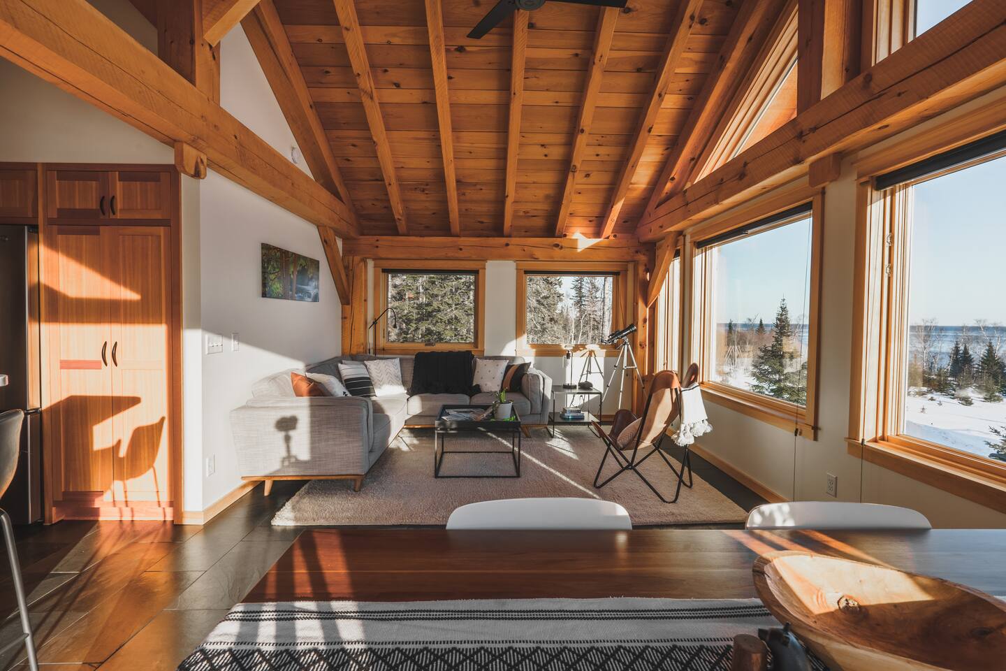 - Stunning Lake Superior View - Fully-Equipped Kitchen - Queen Size Bed - Perfect for SingleTravelers or Couples - Luxurious Cast Iron Tub - Convenient Home Office - Large Cedar Deck, Patio and Firepit - Beach Access Across the Road “We had such a lovely stay at Agua Norte. The loft itself is gorgeous, spacious and clean. The bed was comfortable and there were little touches everywhere that we loved. Great location, less than a 5 minute drive to downtown yet you feel far removed from town. The sauna was great before or after a day of exploring. And we can't begin to explain how beautiful sunrises and sunsets were from the balcony! If you're looking at this place, book now!” - Amy DISCLOSURE: 1. Upon booking, you'll receive our Rental Agreement link via Airbnb messages. You have 48 hours to review, agree, or cancel for a full refund. Keeping your reservation implies agreement. 2. Agua Norte Loft shares property and driveway with Agua Norte Cabin and Tranquilo Cabin. Please see photos for reference or reach out with any questions. ______________ Our property is located in a 20 acre slice of the Northwoods nested in between evergreen trees and gorgeous Lake Superior. The property is full of wildlife, birds, butterflies, wild flowers and wild berries. It is the perfect spot for a couple looking for a romantic and peaceful getaway, or a single person in search of quietude. → LOFT: The 20'x35' building was finished in 2019. Many of the white pine timbers that compose the frame were locally and sustainably logged, sawed and treated by us, the owners. It has 10 huge windows and a cathedral ceiling making this loft very airy, elegant and modern. It has been thoughtfully designed with one or 2 people in mind. → LIVING/DINING ROOM Enjoy a 180 degree view of Lake Superior from anywhere in this area: while sipping coffee on the couch or enjoying a meal at the dining table. The Article couch, soft wool rug and cozy throw blanket will make you snuggle up and enjoy the snow fall. → KITCHEN: The kitchen has full size appliances, doug fir cabinets and white quartz countertop with bar top height stools. It is a beautiful place to cook your meals and enjoy the lake view. It has a fridge and freezer, 4 burner electric stove with oven, coffee maker, blender and all needed cooking and baking utensils. → BATHROOM The bathroom is truly spa like: beautiful, spacious and airy. It has cedar wood paneling, a cast iron tub and a white vessel sink. → ENTERTAINMENT: There is a TV and DVD player in the bedroom. → SAUNA: Andrew finished our 10x14 sauna in 2019. It has cedar paneling and a wood burning stove, a nice size changing area, a large window in the sauna room overlooking Lake Superior and a nice porch to cool off and enjoy the view. While the sauna is shared among our three cabins, guests must reserve their sessions to ensure exclusive time and privacy. → OUTSIDE: Outside, the fire pit is only a few steps away and overlooks Lake Superior. The slate stone patio is wonderful for enjoying the beautiful sunsets and listening to the birds. Oh, and keep an eye out for all the bald eagles! The big tall spruce tree on the edge of the cliff overlooking the lake is the hangout area for these beautiful birds. It is basically guaranteed that you will see one or a couple hanging out on the three and being harassed by crows and seagulls.